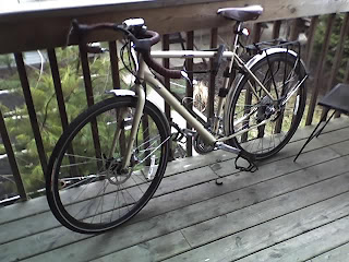 Here is a picture of my new bike- I’m still waiting on the new stem, but I’m slowly mounting some of my old road bike accessories.