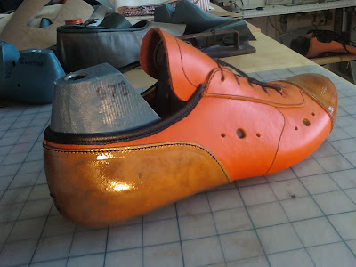 To provide additional stiffness and protection to the external stiffeners, I applied a few coats of shellac. This is a bit of an experiment – shellac is popular with some vintage bicycle enthusiasts for treating handlebar wrap, and I though it would be a nice addition on this shoe- as it is based on vintage styles. It gives it a nice shine and didn’t darken the leather a much as I feared- just a nice warm tone that goes very nicely with the orange leather: