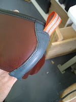 Above is an upper using my Horween “rust” leather with the trim worked from one of the scrap bin leathers – it’s a pretty neat combination.